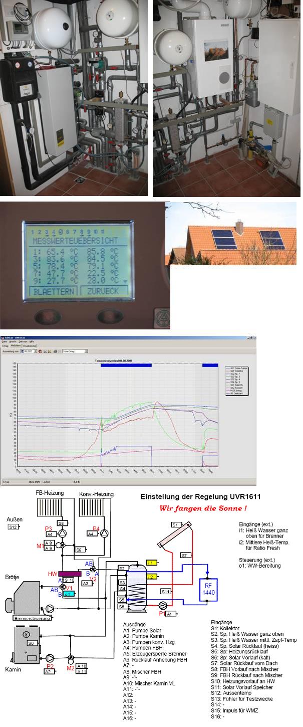 Eingebundene Komponenten, die in den Bereich der Steuerung fallen: - Brennwertgerät Broetje WGB 20 C pro mit Erzeugersperre bei Sonnenaktivität - Frischwasserstation Wagner RF250 - Solarpumpe - 3 Heizkreispumpen ( FB-Heizung, konv. Heizkörper, Kamin) - 2 Mischerventile (FB-Heizung und Kamin) - 2 Umschaltventile (Heißwasserbereitung in der solarfreien Zeit und Rücklaufanhebung der Heizkreise) - Durchflussmengenmessung zur Solarleistungsberechnung - sowie die Erfassung sämtlicher Temperaturfühler in der Installation